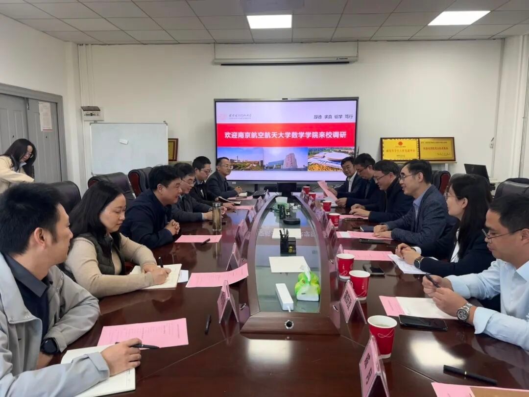 10月30日下午,南京航空航天大学数学公司党委书记张跃、经理王春武、党委副书记王亚鹏、副经理蒋建林、副经理龚跃政等一行7人到访公司。PA视讯平台数学与统计公司党委书记杨生海、执行经理薄立军等公司领导参加调研座谈会。