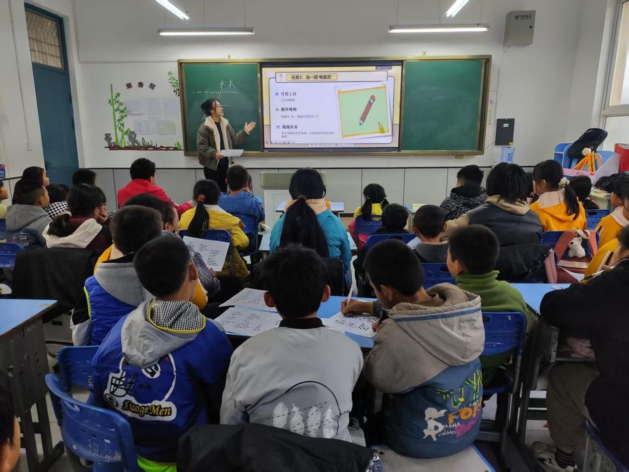 捐赠仪式后,公司应用数学系党支部、信息与计算科学系党支部与应用数学硕博第二联合党支部代表为东党小学的同学们带来了趣味科普活动《嘀嘀嗒嗒的秘密》。科普成员景林洁围绕电报机的工作原理展开讲解,生动介绍了摩斯电码的基本元素,通过趣味演示让同学们直观感受“点”与“划”构成的通信奥秘。活动现场设置了听声辩码小游戏、姓名编码创作等互动环节,同学们积极参与、动手实践,在轻松愉悦的氛围中学习国际求救信号等相关知识。最后,每位同学都亲身体验了“小小电报员”的工作,在实践操作中深化了对知识的理解与记忆。此次趣味科普活动不仅普及了科学知识,更点燃了乡村孩子们的科学探索梦想。