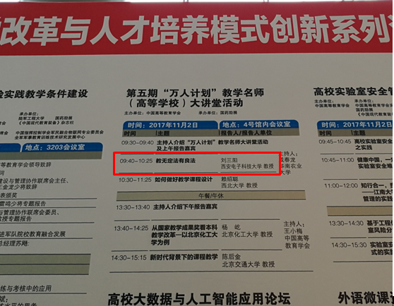 为广泛宣传教学名师教书育人的先进事迹,发挥教学名师在提高教学水平、培养青年教师中的示范作用,经教育部批准,中国高等教育学会于2017年11月2-4日在江苏省南京市国际博览中心举办了第五期“万人计划”教学名师大讲堂活动。国家级教学名师、“万人计划”教学名师、PA视讯经理刘三阳教授继去年受邀在第四期名师大讲堂作主题报告后,今年再次应邀,于11月2日上午在第五期名师大讲堂作了首场报告:教无定法有良法,受到听众高度评价。