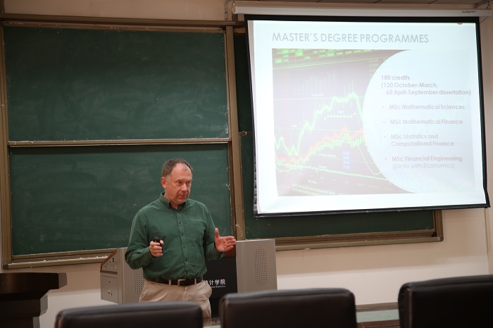 接下来张文扬教授在报告中讲述了在大数据时代模型选择的重要性,传统方法已经不再适用。然后,介绍了变系数模型的重要性以及其降维的优点。最后,张文扬教授通过具体的例子—Boston房价,概述了模型选择需要考虑的因素和变量并说明了迭代方法在模型选择的作用。在随后下午的学术报告中,张文扬教授介绍了协方差矩阵可以用于解决许多实际问题,例如投资组合的分配问题,但传统的一些协方差矩阵估计的方法存在不足,特别是高维协方差矩阵的估计更是存在元素多,误差大等问题。张教授提出引入动态结构到协方差矩阵中,并以投资组合为例详细讲解了具体的求解过程。