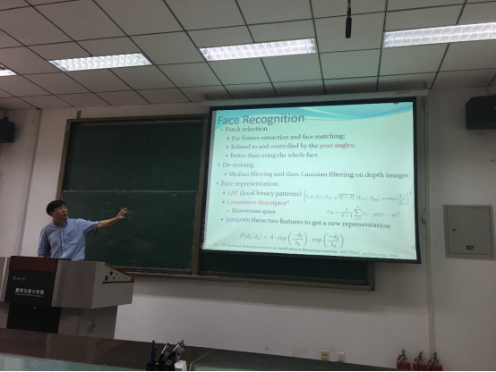 在第二次报告中,郭国栋副教授以其研究的历程为主线,一步一步的介绍了基于视觉分析的人工智能研究的历史和现状。郭老师着重介绍了他每一阶段工作的灵感和工作的意义。比如,郭教授团队是第一个研究根据面部照片来识别人体体脂率的,他们的研究成果得到了学界的广泛关注和科学新闻的报导。在报告中,郭教授不仅仅介绍了其研究工作,还着重强调了研究与企业和国家的实际需求之间的联系。 研究成果能够解决企业和国家面临的问题是研究者选题和做研究时应该重点考虑的一个方面。最后郭教授介绍了利用深度学习的方法进行面部识别已经获得的一些进展和面临的挑战。在报告的最后,郭教授用了半个小时的时间耐心细致的回答了听众的问题。朱强教授主持了会议,数统院的一些博士生、硕士生和公司的一些本科生参加了郭教授的报告。