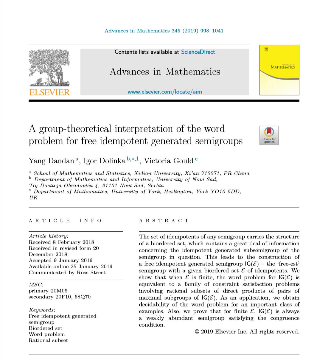 近日,PA视讯杨丹丹副教授与塞尔维亚诺维萨德大学Igor Dolinka教授和英国约克大学Victoria Gould教授合作,在国际顶级数学期刊《Advances in Mathematics》上发表了题为“A group-theoretical interpretation of the word problem for free idempotent generated semigroups”的学术论文,正式发表期卷号: Advances in Mathematics, 345, 2019, 998-1041。