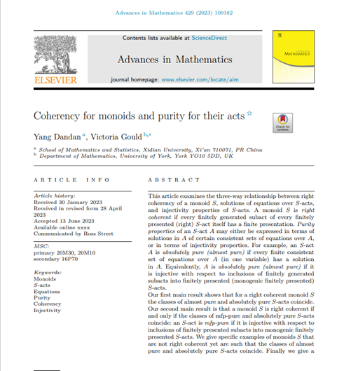近日,西电PA视讯杨丹丹教授与英国约克大学Victoria Gould教授合作,在数学领域国际顶级期刊Advances in Mathematics上发表了题为“Coherency for monoids and purity for their acts”的长达47页学术论文。这是继2019年之后,杨丹丹再次在此刊发表论文。期刊Advances in Mathematics(数学进展)创刊于1961年,致力于发表纯数学各领域具有突破性的重要成果,是业内公认的数学类顶级期刊,具有很高的学术声誉。杨丹丹教授此次发表论文是西电在数学研究领域的重要突破。
