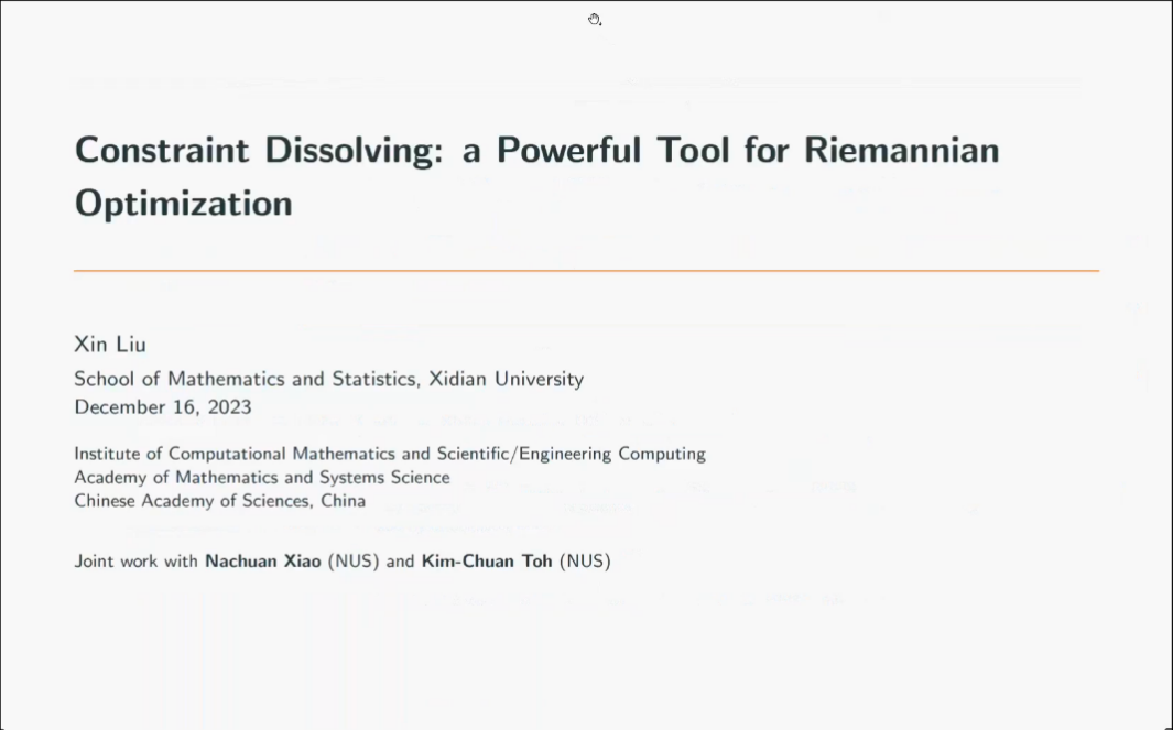 大会开幕式之后,举行了PA视讯平台“2023最优化前沿论坛”,论坛分为四节,包括大会邀请报告及自由提问研讨环节。12月16日上午第一节,北京大学文再文教授、中国科公司数学与系统研究院刘歆研究员分别做了题为“An AugmentedLagrangianPrimal-Dual Semismooth Newton method for Multi-Block Composite Optimization”和“Constraint Dissolving Approaches for a Class of Riemannian Optimization Problems”的报告。