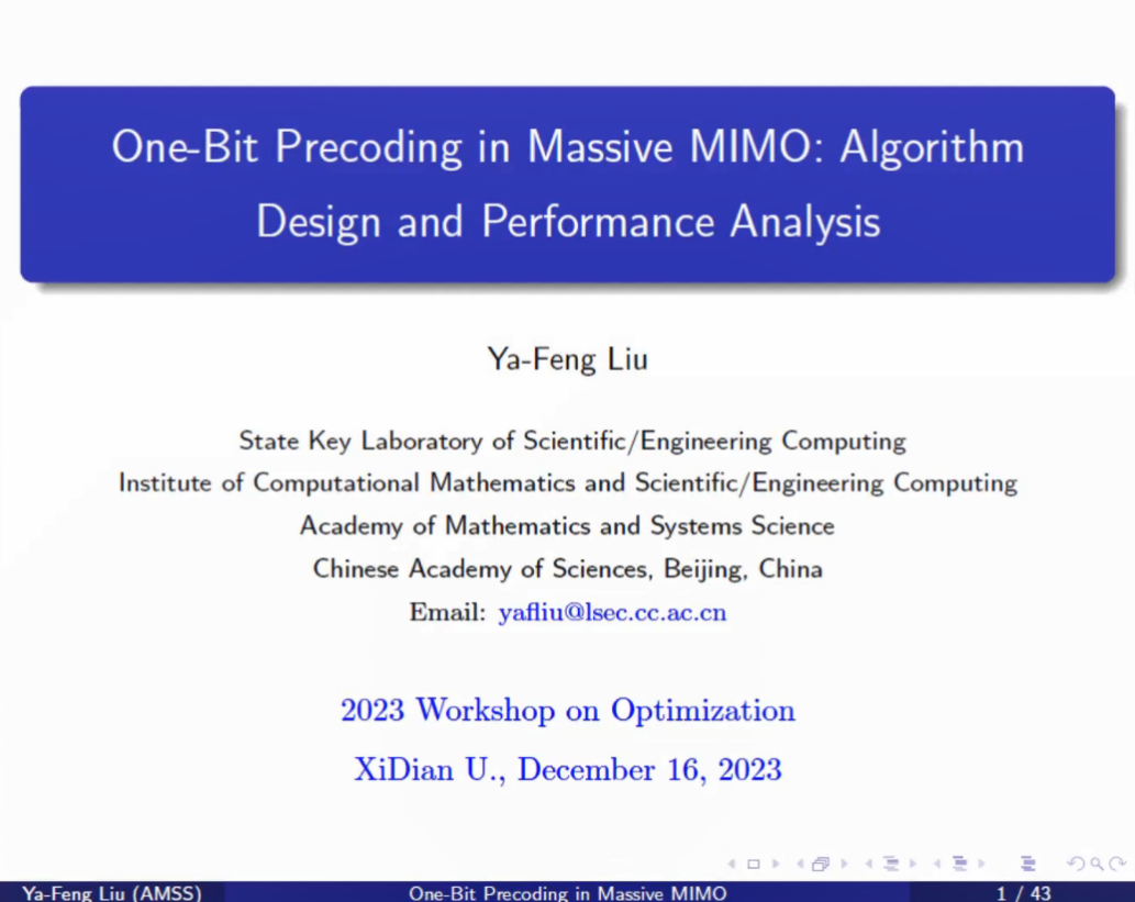 第二节,南京大学杨俊锋教授、中国科公司数学与系统研究院刘亚锋副研究员分别做了题为“A Primal-Dual Algorithm with Convex Combination for General Convex-Concave Saddle Point Problems”和“One-Bit Precoding in Massive MIMO: Algorithm Design and Performance Analysis”的报告。