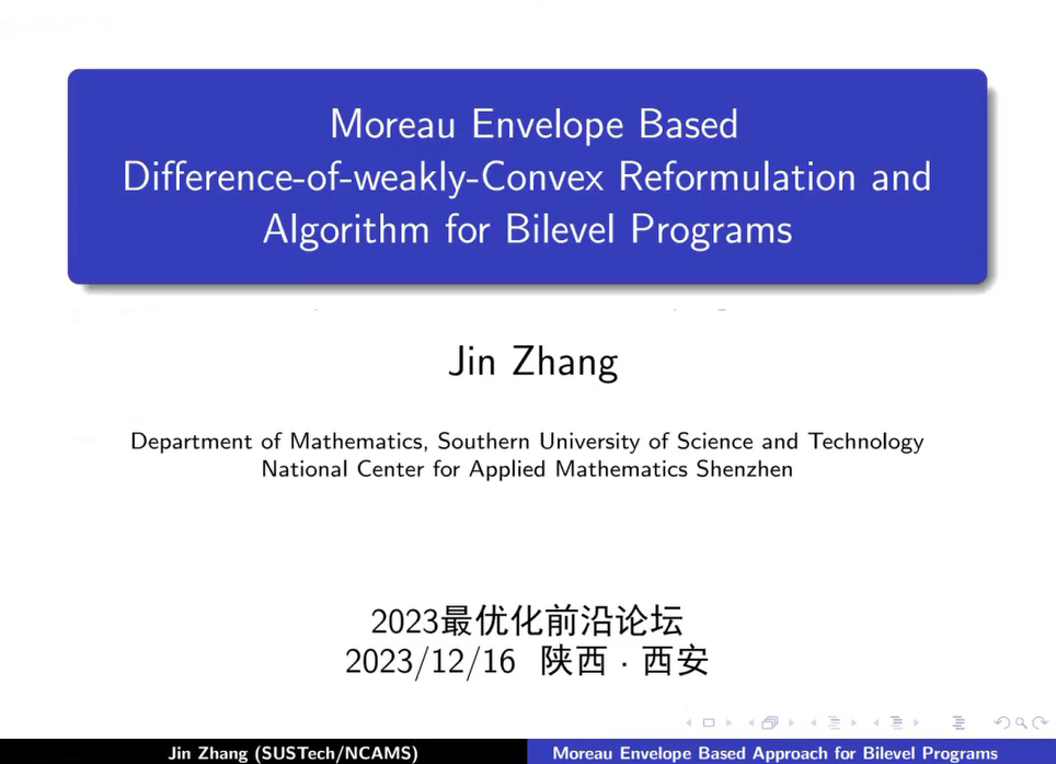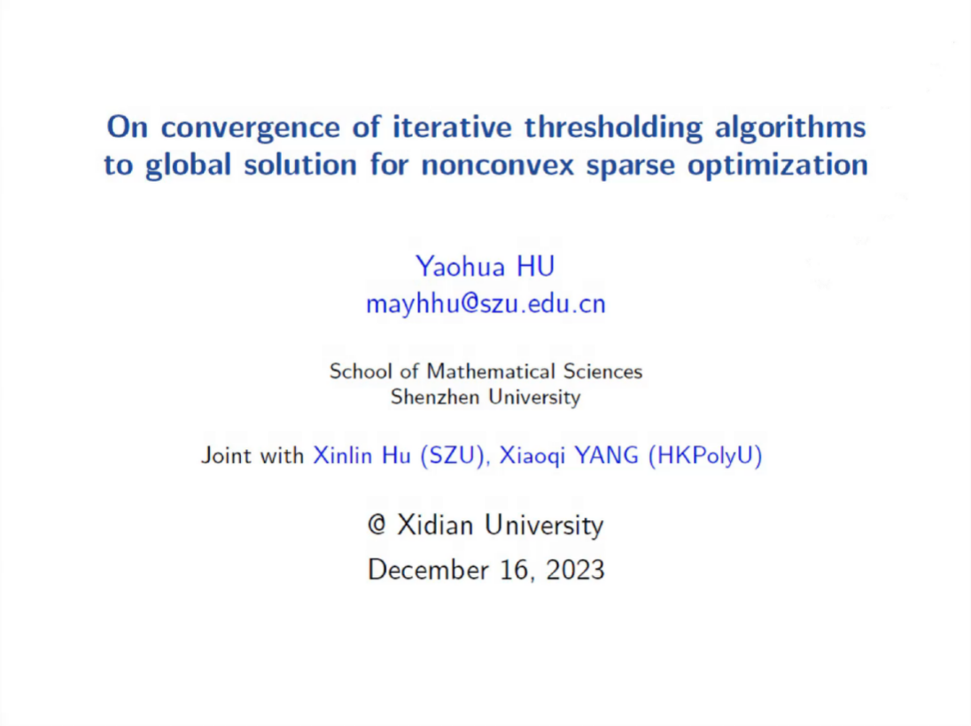 第四节,深圳大学胡耀华教授、南方科技大学张进副教授分别做了题为“On Convergence of Iterative Thresholding Algorithms to Global Solution for Nonconvex Sparse Optimization”和“Moreau Envelope Based Difference-of-weakly-Convex Reformulation and Algorithm for Bilevel Programs”的报告。
