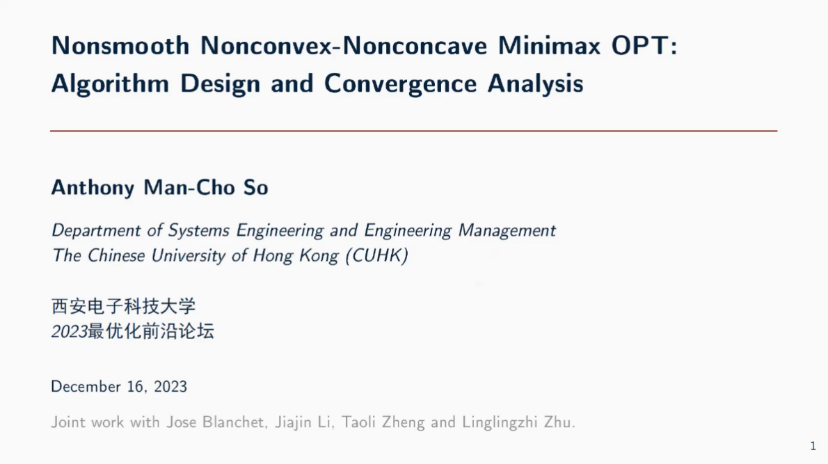 12月16日上午8:30,大会举行开幕式,PA视讯刘三阳教授代表主办单位致辞。随后,北京大学文再文教授、中国科公司数学与系统研究院刘歆研究员和刘亚锋副研究员、香港中文大学苏文藻教授和曾铁勇教授、南京大学杨俊锋教授、深圳大学胡耀华教授、南方科技大学张进副教授等8位学者先后在上午和下午作了报告。