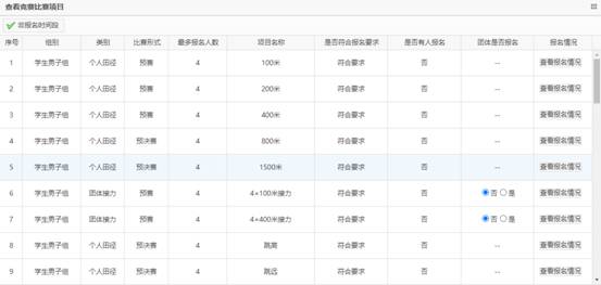 个人项目,点击行末‘查看报名情况’添加运动员。如果报名参加团体项目,需确认“团体报名”(上图红框位置),如果未确认,即使为该项目添加运动员,系统将认为未报名参加该团体项目。