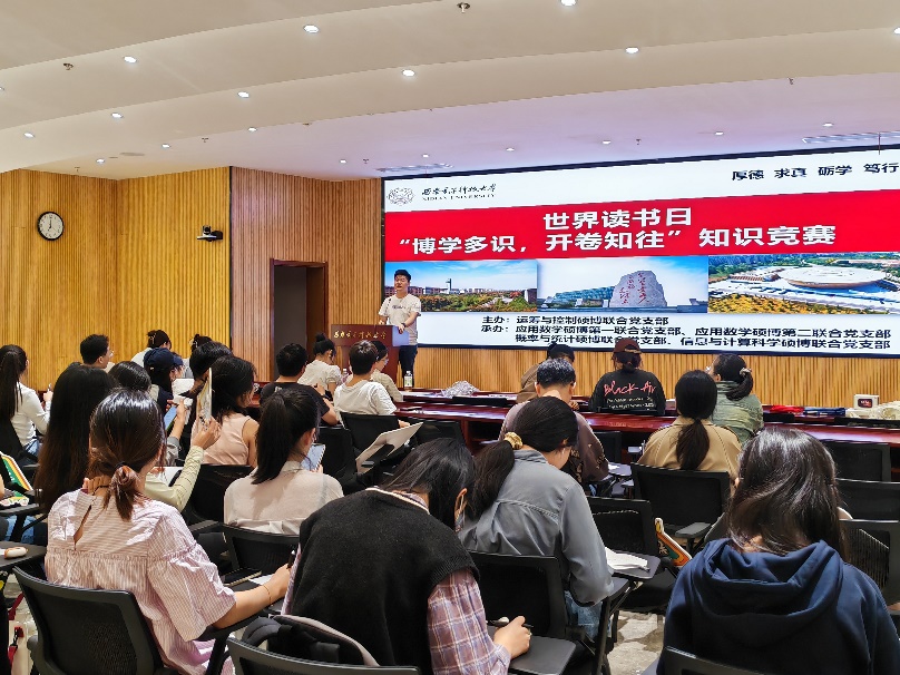 (通讯员王宇东)为深入学习贯彻党的二十大精神,弘扬中华优秀传统文化,筑牢文化自信。4月21日,由PA视讯运筹与控制硕博联合党支部主办,应用数学硕博第一联合党支部、应用数学硕博第二联合党支部、概率与统计硕博联合党支部和信息与计算科学硕博联合党支部协办的“博学多识,开卷知往”主题党日活动于网安大楼103报告厅举行。活动由运筹与控制硕博联合党支部书记王宇东主持。