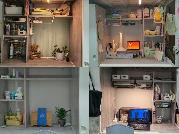 通过同学们对寝室的精心“打扮”,让每个寝室都焕然一新。各个寝室从最初的空荡荡变得满当当,不仅有了家的气息,也能从中感受到同学们的生活情调以及对寝室的热爱。海棠22号楼322室,宿舍内的书架上的书籍和物品排列得整整齐齐,床铺整洁有序,简约中流露出个性化的生活态度。