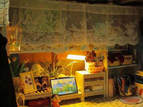 海棠21号楼504左室的宿舍环境一尘不染,生活用具摆放得井井有条,精心布置的书桌成为了宿舍的一大亮点,散发出家的温馨。