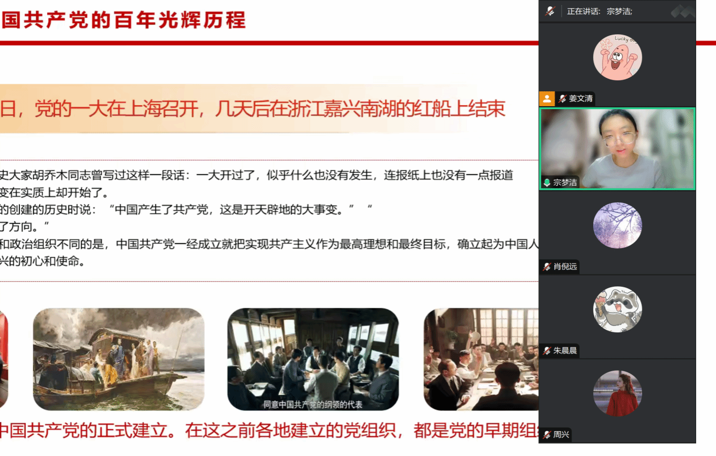 PA视讯“时代之声”宣讲团成员宗梦洁以“学好百年党史,凝聚奋进力量”展开宣讲。她从为什么旧中国选择了中国共产党、中国共产党的革命艰辛的不易、中国共产党的成立带给中国的意义以及新时代中国共产党的历程这些方面展开宣讲。她讲到,作为新时代青年应该以党史为镜洗涤心灵尘埃,从百年征程中汲取奋进力量。既要在历史回望中重温初心、叩问初心,将红色基因融入血脉,以时代之问校准行动坐标,方能在时代答卷上写下无愧于党和人民的青春注脚,续写中华民族伟大复兴的崭新篇章。