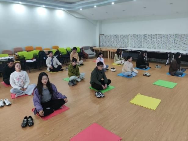 活动特别设置了正念冥想环节,在老师的温柔引导下,同学们闭目深呼吸,让忙碌的心灵暂时停下脚步。“闭眼深呼吸时,像给乱糟糟的脑子按下暂停键,几分钟后再睁眼,会觉得周围的声音都轻了点。” 一位同学如此描述自己的体验。