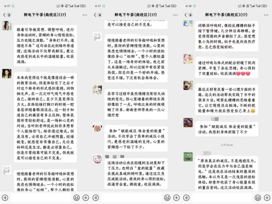 通过身体扫描和意象引导等专业方法,同学们学会了如何与自己的情绪共处,如何接纳不完美的自己。活动中,老师引导大家想象小鸟飞翔的场景,借自然之力实现心灵疗愈,让参与员工在轻松舒适的氛围中完成了心灵减压。