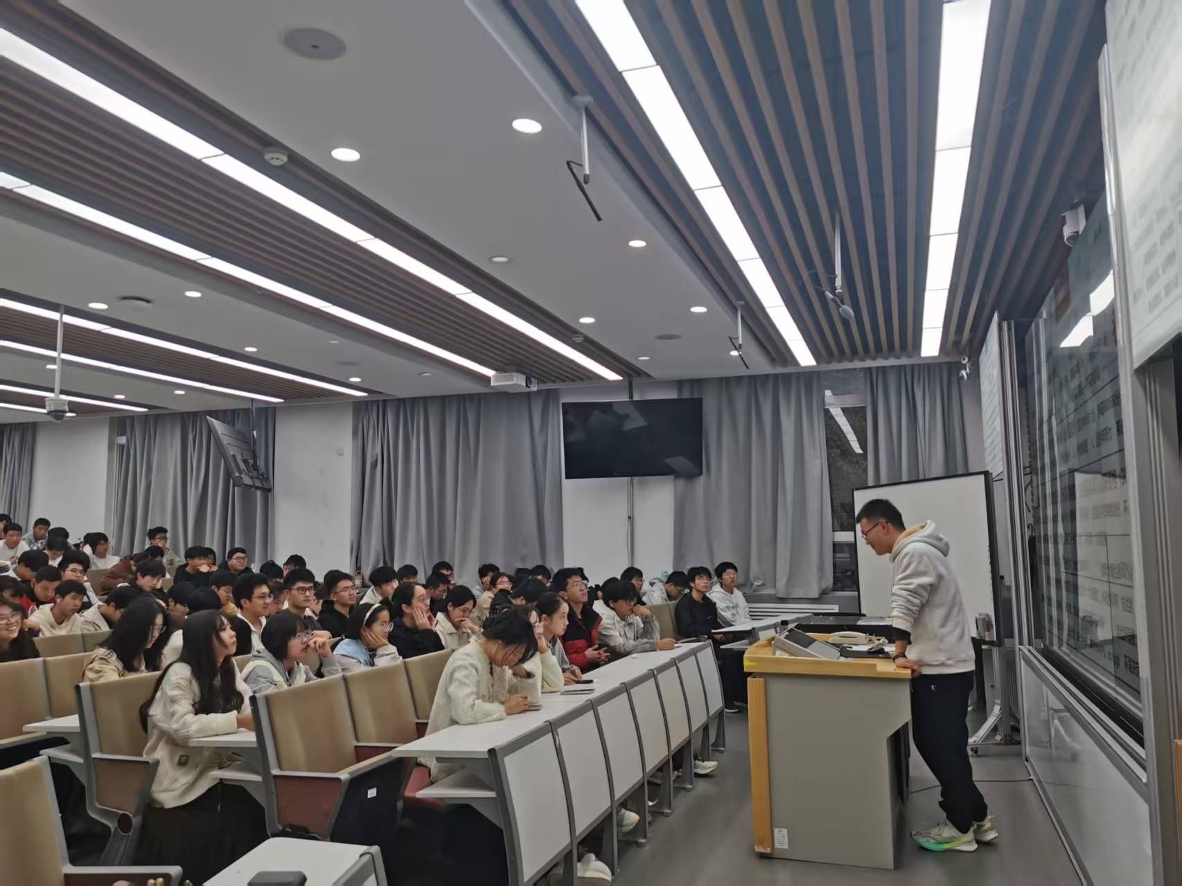 主题班会开篇以“学长经验分享”为核心环节,特邀高年级优秀员工杜旭昭,结合自身学业规划与成长经历,为学弟学妹们带来干货满满的“求学指南”。分享中,杜旭昭学长紧扣“目标导向”与“高效执行”两大关键词,在学业规划方面,他细致拆解“深造”与“就业”两条路径的核心差异,从保研成绩的构成到考研备考的时间节点与科目侧重,用具体数据与真实案例帮助同学们清晰定位;在学习方法方面,他分享了“课堂前排专注听讲、图书馆沉浸式研学、遇到困难及时解决”的实操技巧,强调“把功夫下在平时”的重要性;最后,他以“自信是底气,自律是保障”为结语,鼓励学弟学妹们平衡学业热忱与理性规划,在数理学科的学习中找准节奏、稳步进阶。