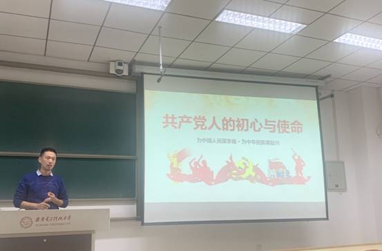 靳志伟先从数学与统计公司党委发展党员工作流程展开,让同学们了解到成为一名党员的大致流程与成为一名合格党员的不易。随后播放了一段有关抗美援朝和一段有关中共党员李白的短视频,使同学们认识到了中国共产党的先进性与党员的无私奉献精神。随后,又从“走进共产党人初心”、“新时代党的历史使命”、“中国共产党最有理由自信”及“从严治党,开创未来”等方面解读了“初心与使命”的深刻内涵。中国共产党的初心和使命,就是为中国人民谋幸福,为中华民族谋复兴;不断增进人民福祉、实现人民幸福,是党的初心使命的集中体现与现实反映。