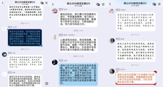 4月6日,中共中央总书记、国家主席、中央军委主席习近平致信祝贺厦门大学建校100周年,向全体师生员工和海内外员工致以热烈的祝贺和诚挚的问候。贺信在全国教育系统广大干部师生中引发热烈反响,PA视讯硕士2019级党支部全体成员热议回信内容。