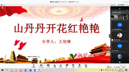 会议第三项由西北工业大学马克思主义公司学硕士生支部王培琳同志作支部品牌活动红歌分享——《山丹丹花开红艳艳》。该歌曲是一首以陕甘民歌作为表现形式颂扬红色政权的歌曲,全曲用西北人民的语言(包括音乐语言)生动地、恰如其分地描绘了中央红军到达陕北的革命历史史实,自此中国革命重心从南方移到北方,延安成为革命的圣地。通过观看视频了解了歌曲的创作背景,剖析歌词感受到这首歌既体现了陕甘红火的苏区和英勇善战的红军精神,又歌颂了毛泽东一代伟人的丰功伟绩,把一个火红的苏区变成了抗日战争、解放战争的总后方。
