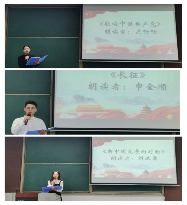 在主持人宣读完比赛规则及评分细则后,朗诵比赛正式拉开帷幕。首先进行的是个人赛,参赛选手们一个个仪态端庄,感情充沛,语气或轻缓或激昂。选手马若男朗诵的《我的祖国》抒发了自己的爱国热情,歌颂祖国源远流长的历史和人民坚韧执着的性格;选手申金顺朗诵的《长征》带领着现场观众走进那段难以忘怀艰难而又充满力量的长征岁月;选手关畅畅朗诵的《歌颂中国共产党》回望了在党领导下,中国一步步发展走向世界的历史,中华不屈的信念在中华儿女的心中生根发芽。还有选手李绍轩、王润松、刘汶霖也结合新中国的发展历程表达了对祖国深深的热爱,参赛选手们的出色表现获得现场观众们的阵阵掌声,得到了评委们的一致肯定。