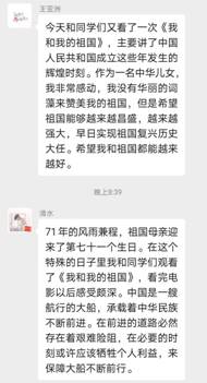“迎国庆、忆初心”观影活动由硕士2019级党支部组织,播放的电影为《我和我的祖国》,这部影片通过讲述新中国成立以来的七个比较典型的事件,让大家一起回忆祖国往昔的光辉岁月,拾起那些难忘的红色记忆。大家看完后,纷纷发表了自己的观后感,深深地表达了对祖国母亲的爱意。
