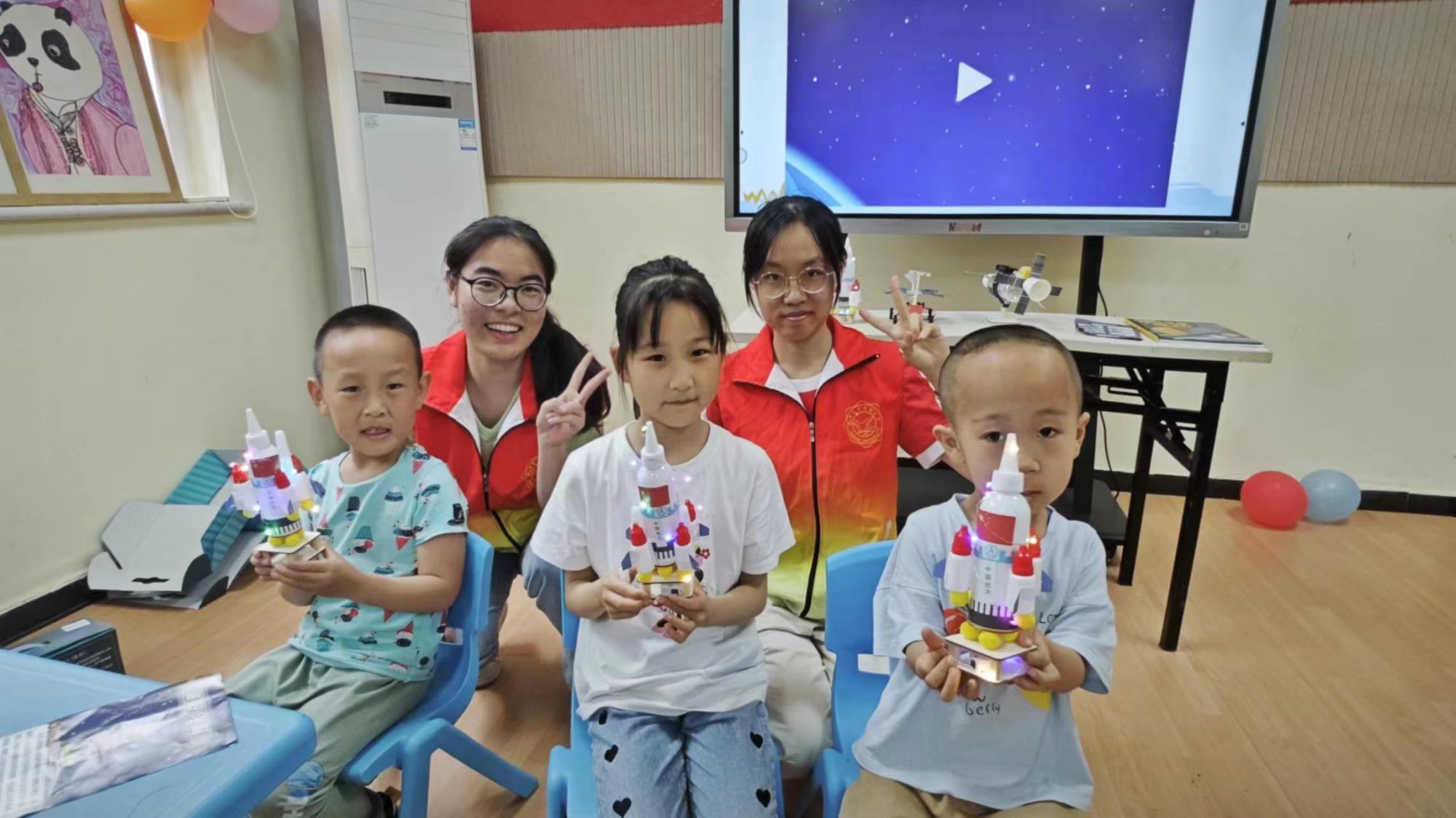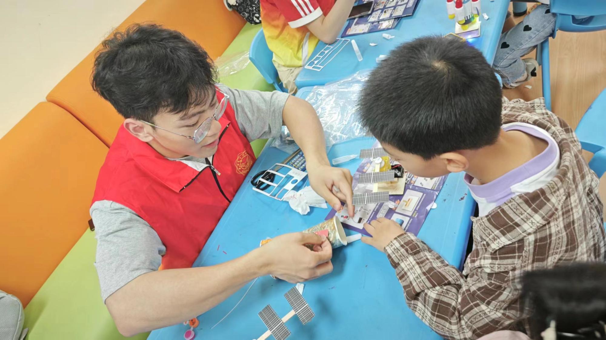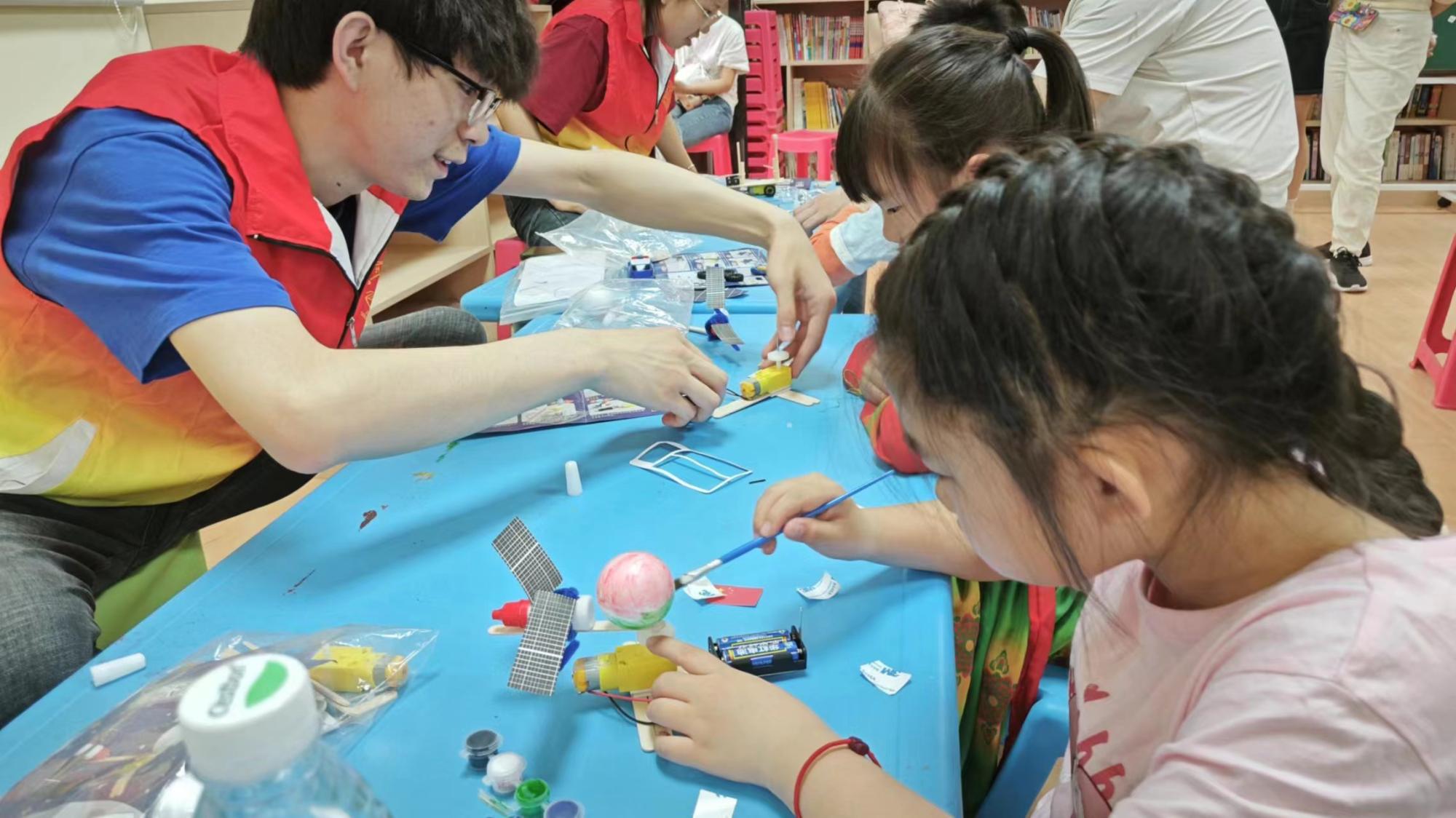 模型制作环节中,小朋友们分为分别跟随不同志愿者制作宇宙空间站、中国空间站、神州火箭、火星车、宇宙卫星、天宫飞船6款不同的航天模型。航空航天模型制作不仅培养了小朋友们的动手能力,还激发了他们对科学和技术的兴趣,同时也有助于提升他们的创造力和想象力。通过志愿者带领亲手制作并讲解不同模型,小朋友们可以更加直观地了解卫星、天宫飞船、空间站的结构和功能,增加她们对卫星及其相关知识的兴趣。经过志愿者们耐心讲解和细心的帮助,15位参与活动的小朋友都成果的完成了自己的作品,看到模型亮灯和启动的时小朋友们发出了阵阵自豪的欢呼。