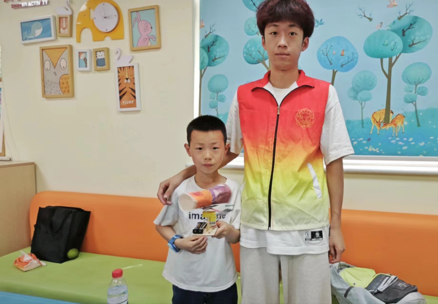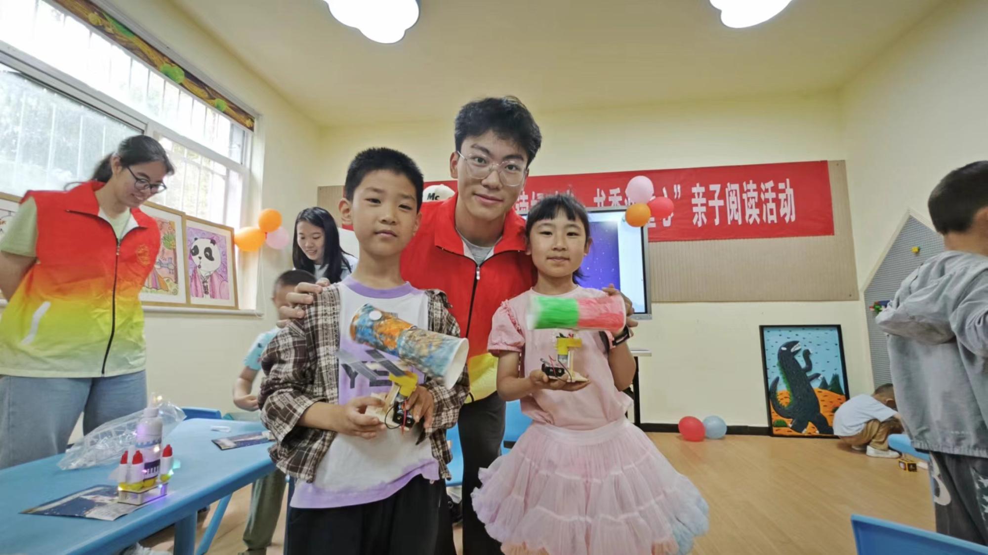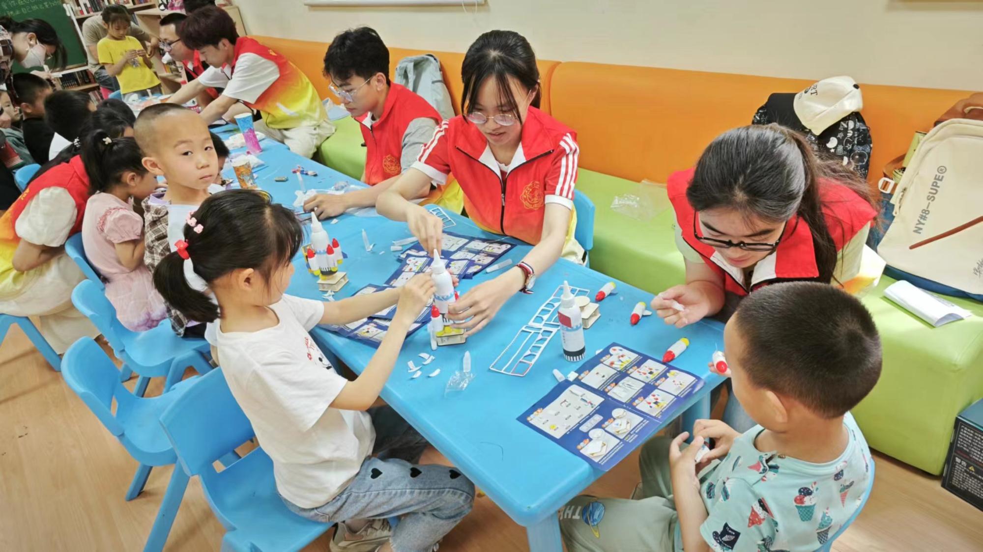 模型制作环节中,小朋友们分为分别跟随不同志愿者制作宇宙空间站、中国空间站、神州火箭、火星车、宇宙卫星、天宫飞船6款不同的航天模型。航空航天模型制作不仅培养了小朋友们的动手能力,还激发了他们对科学和技术的兴趣,同时也有助于提升他们的创造力和想象力。通过志愿者带领亲手制作并讲解不同模型,小朋友们可以更加直观地了解卫星、天宫飞船、空间站的结构和功能,增加她们对卫星及其相关知识的兴趣。经过志愿者们耐心讲解和细心的帮助,15位参与活动的小朋友都成果的完成了自己的作品,看到模型亮灯和启动的时小朋友们发出了阵阵自豪的欢呼。